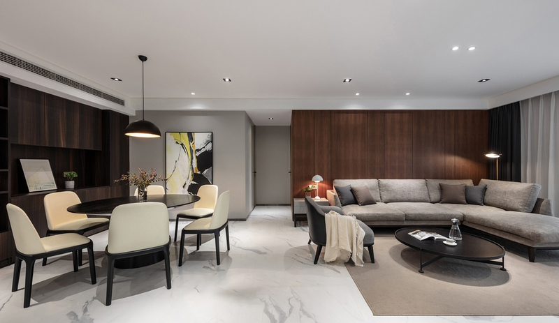 客厅以直拼浅胡桃木为沙发背景,以亚光暖白烤漆实木作电视背景,将融合灰调的PANTON主打色STWEET CORN墙面作为过渡,链接不同色调的温润木质,在冷静理性中完成层次感的营造。全屋唯一的主灯设在餐厅,嵌入式点光源交相辉映,以不同色温配最大化各类材质的细腻光泽。